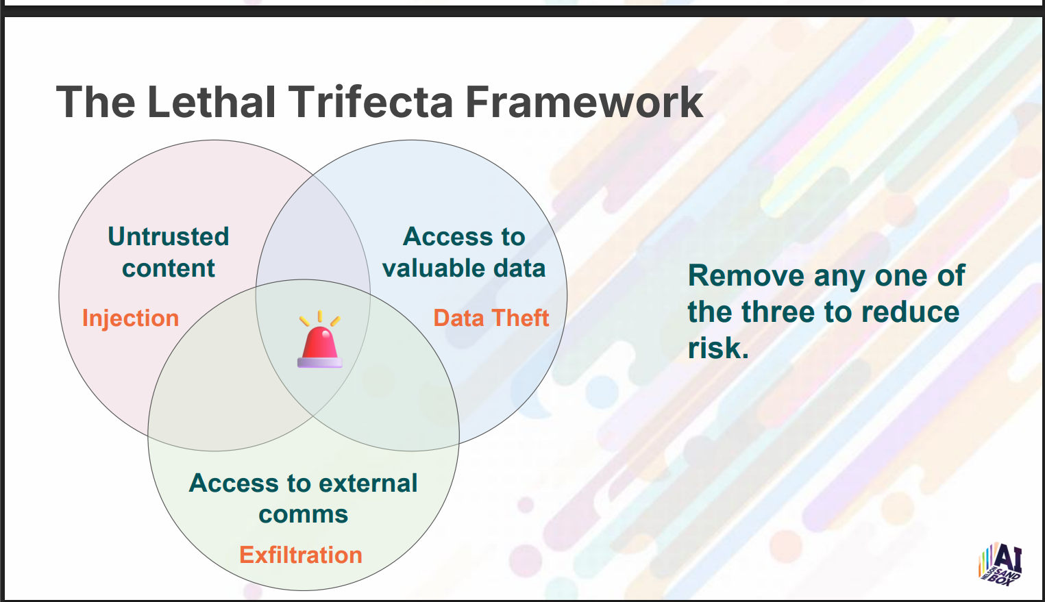 Lethal Trifecta: Risk arises when systems have (1) untrusted content, (2) access to valuable data, and (3) external communications. Remove one to reduce risk.