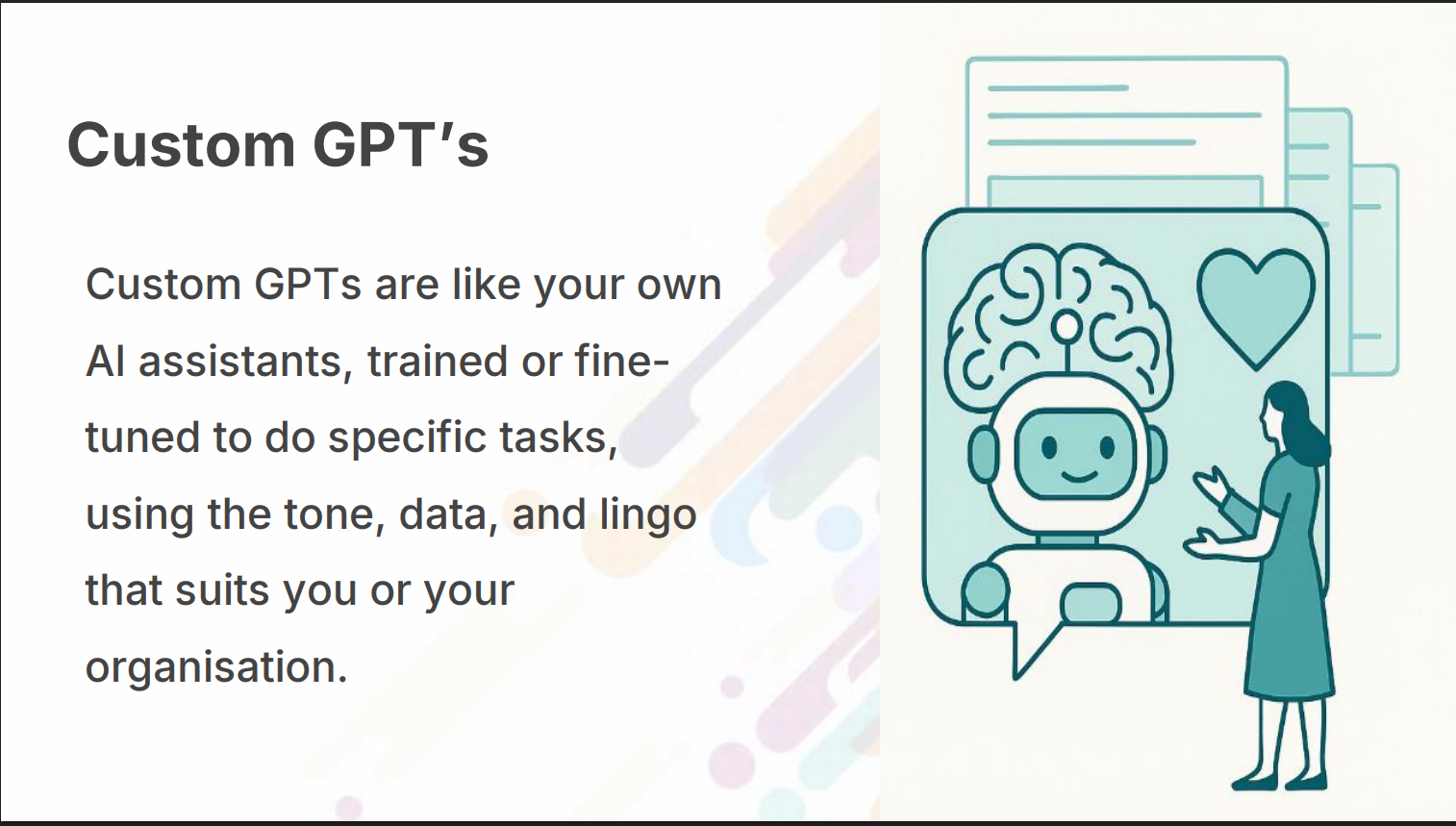 Personalised versions of ChatGPT tailored to an organisation’s tone, data, and needs.