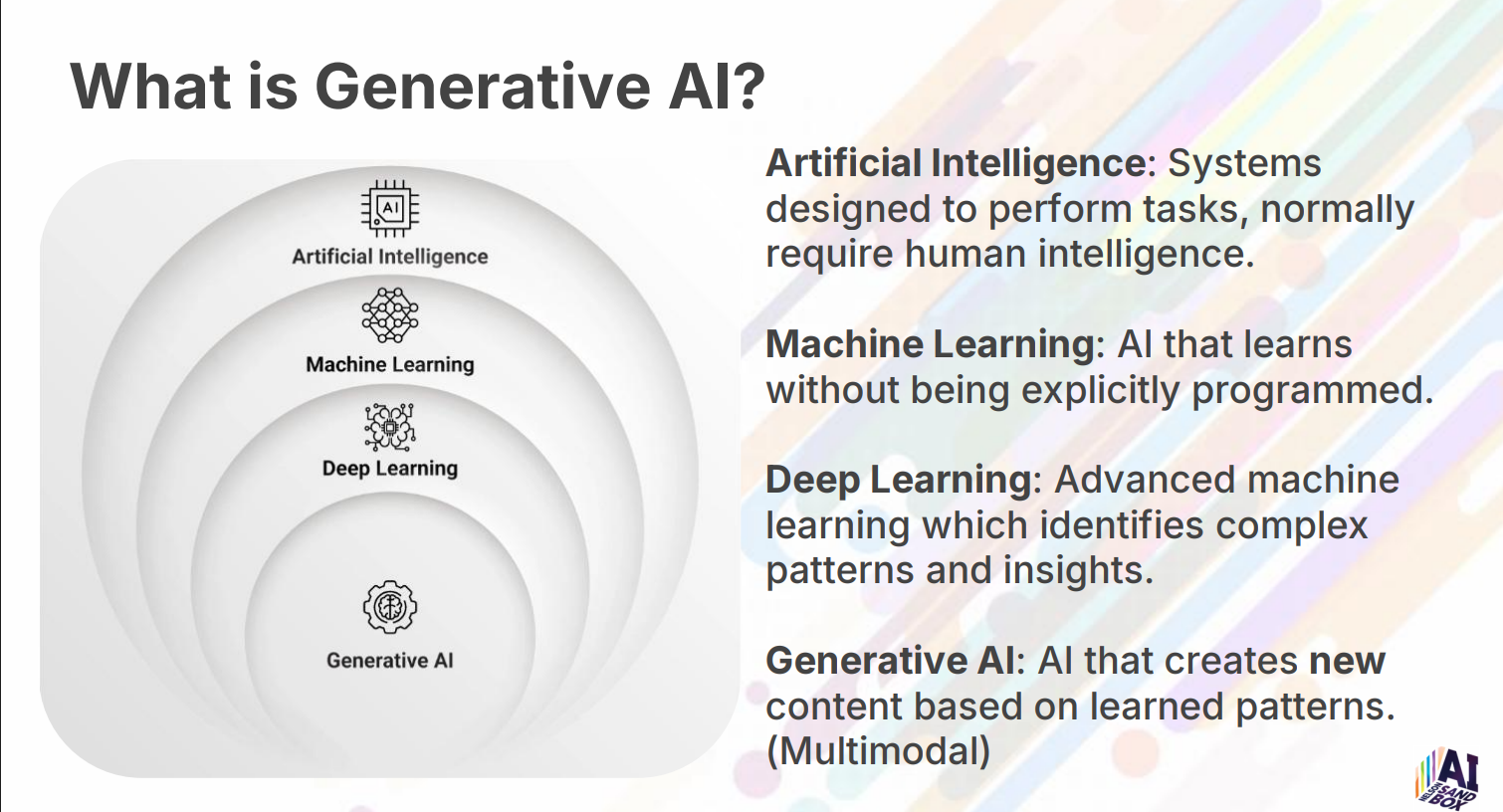 Generative AI = creates new content (text, images, video, music, code).